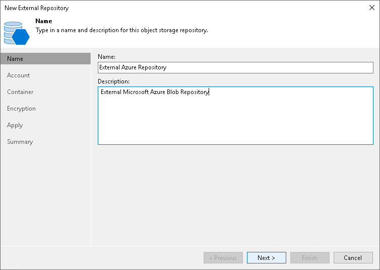 This is an archive version of the document. To get the most up-to-date information, see the current version. Step 2. Specify External Repository Name At the Name step of the wizard, specify a name and description for the external repository.