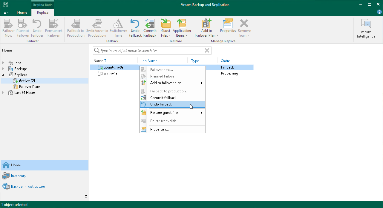 - In the working area, select the necessary replica and click Undo Failback on the ribbon. Alternatively, you can right-click the necessary replica and select Undo Failback.