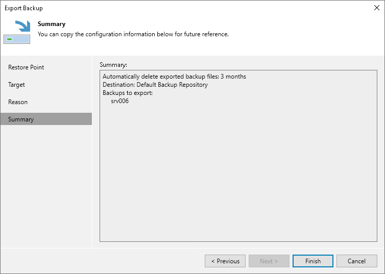 At the Summary step of the wizard, review summary information, click Finish and wait until the export session, which is described in section Viewing Session Statistics, is complete.