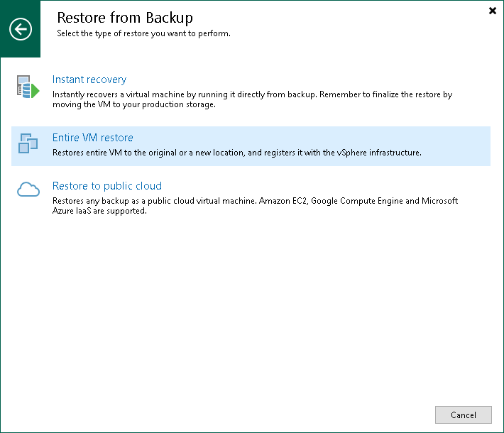 - On the Home tab, click Restore > VMware vSphere > Restore from backup > Entire VM restore > Entire VM restore.