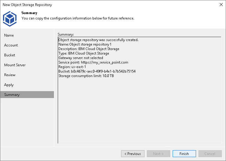 At the Summary step of the wizard, review details of the newly created object storage repository and click Finish.