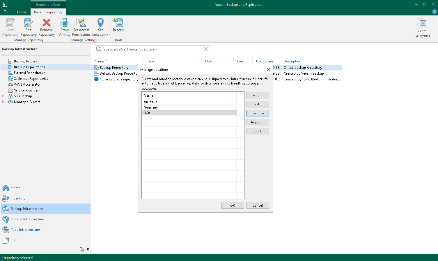 - In the Manage Locations window, select the location and click Remove. If the location is currently assigned to some infrastructure objects, Veeam Backup & Replication will display a warning with the list of objects that belong to this location. Click Yes to confirm the location deletion.