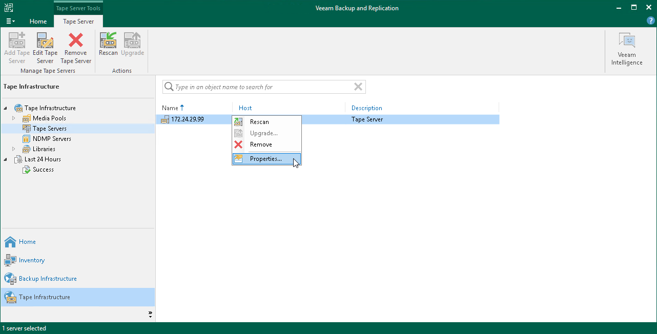 - Select the necessary server in the working area and click Edit Tape Server on the ribbon. You can also right-click the necessary server in working area and select Properties.