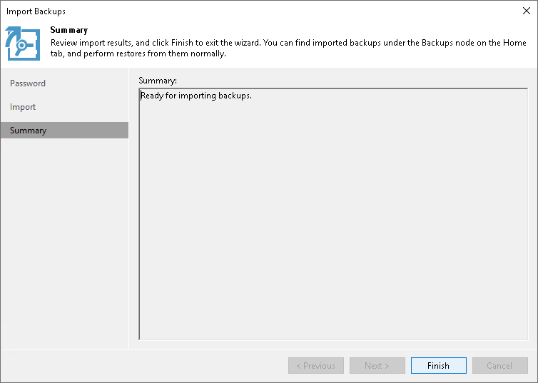 This is an archive version of the document. To get the most up-to-date information, see the current version. Step 4. Finish Working with Wizard At the Summary step of the wizard:Review details of the import operation.Click Finish to run a Configuration Database Resynchronize session.During this session, all existing backups will be imported into the Veeam Backup & Replication console.