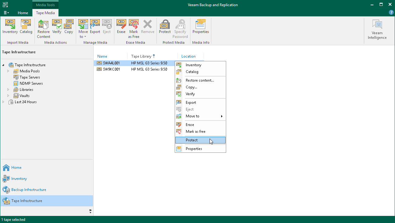 If you have tapes for which you need to change the retention to 'never overwrite', you can protect them. Protection option sets lifelong retention period for the selected tapes overriding the retention settings of the media pool.