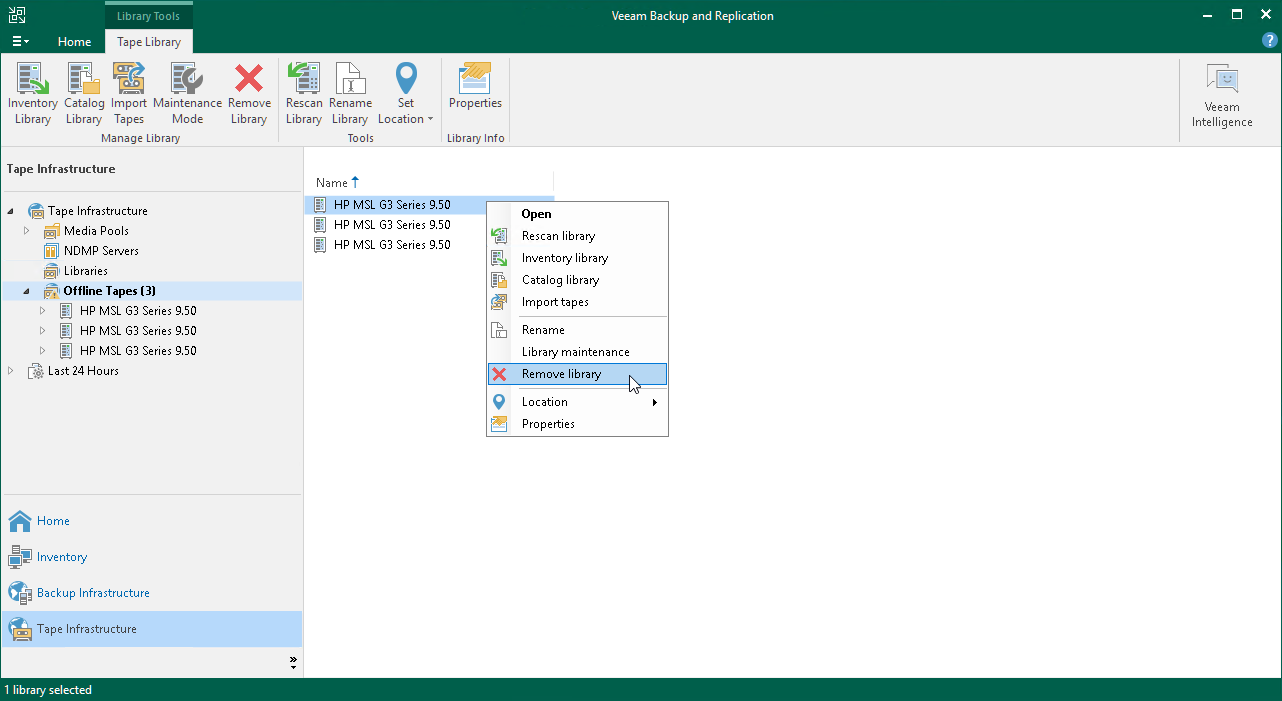 If you want to stop using a tape library or standalone tape drive, you can remove it from your Veeam backup console.