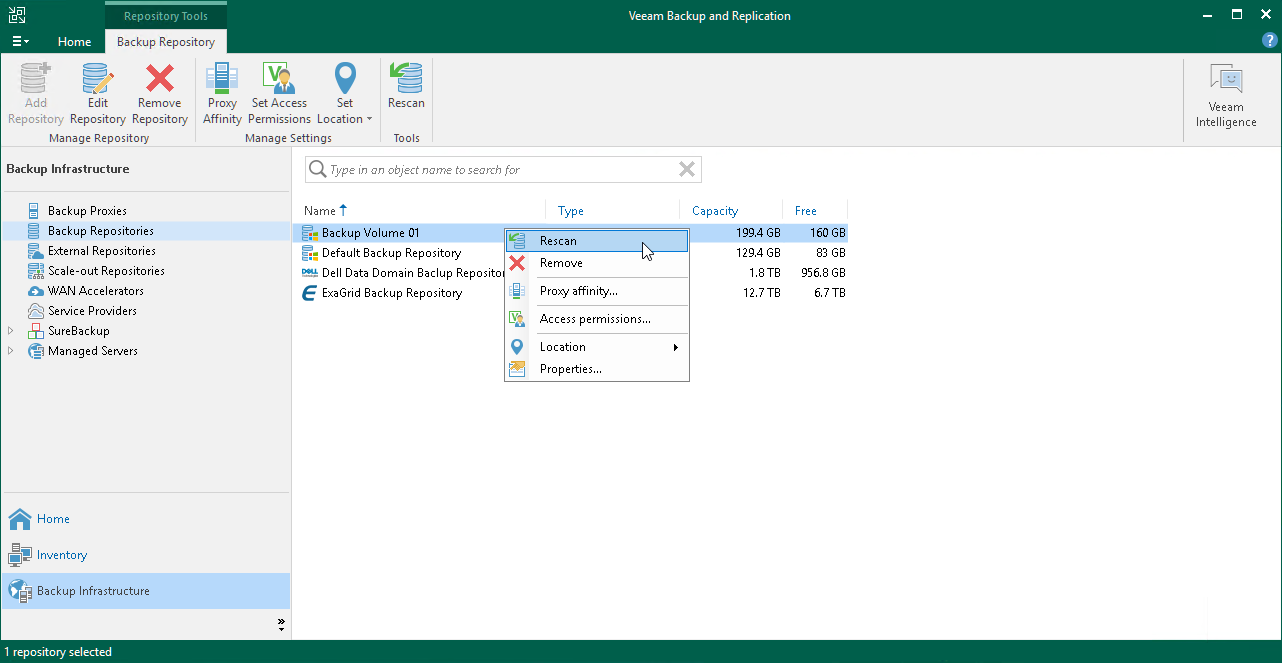 - In the working area, select the backup repository and click Rescan Repository on the ribbon or right-click the backup repository and select Rescan repository.