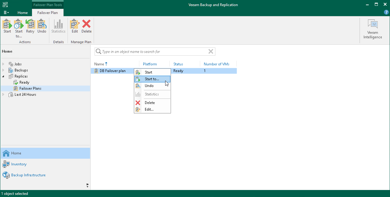 In this case, Veeam Backup & Replication searches for the latest restore point of VM replicas across all replication jobs configured on the backup server. For example, you have 2 jobs that replicate the same VM: Job 1 has created the most recent point at 2:00 AM and Job 2 has created the most recent restore point at 3:00 AM. When you run the failover plan using the Start command, Veeam Backup & Replication will pick the restore point created at 3:00 AM with Job 2.