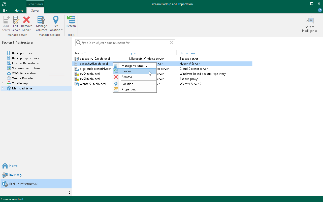 - In the working area, select the server or host and click Rescan on the ribbon. Alternatively, you can right-click the server or host and select Rescan.