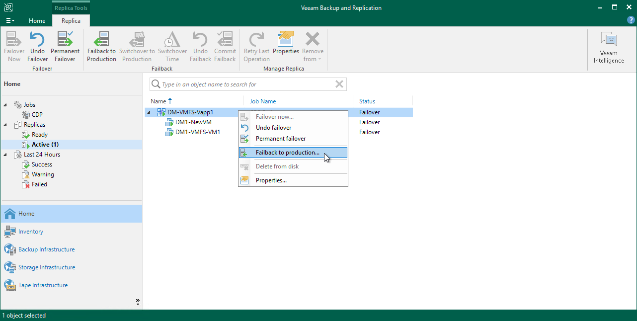 - Open the Home view, in the inventory pane select Replicas > Active. In the working area, right-click the necessary replica and select Failback to production. Alternatively, click Failback to Production on the ribbon.