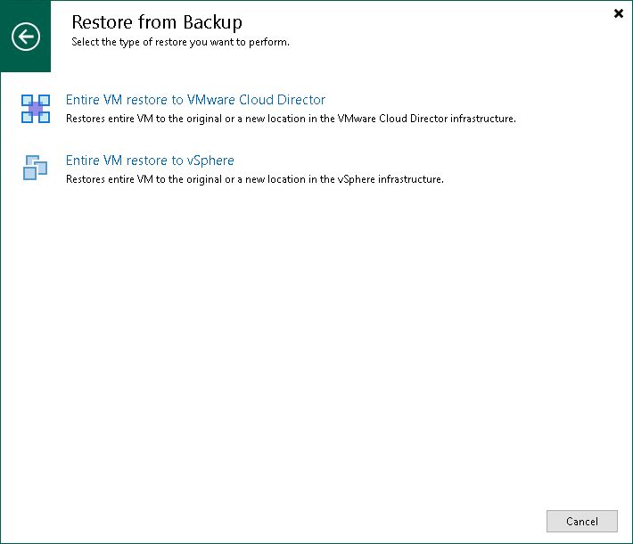 - On the Home tab, click Restore and select VMware Cloud Director. In the Restore window, select Restore from backup > VM restore > Entire VM restore > Entire VM restore > Entire VM restore to VMware Cloud Director.