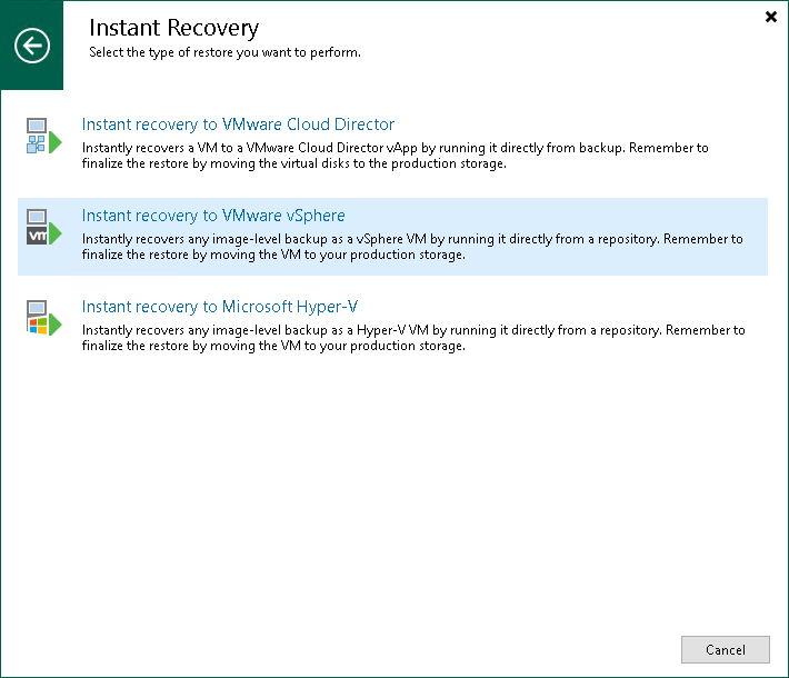 The process of Instant Recovery for VMware Cloud Director VMs does not differ from the regular Instant Recovery process. For more information, see Performing Instant Recovery to VMware vSphere.