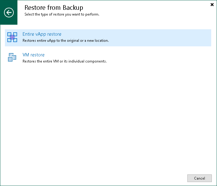 - On the Home tab, click Restore and select VMware Cloud Director. In the Restore window, select Restore from backup > Entire vApp restore.