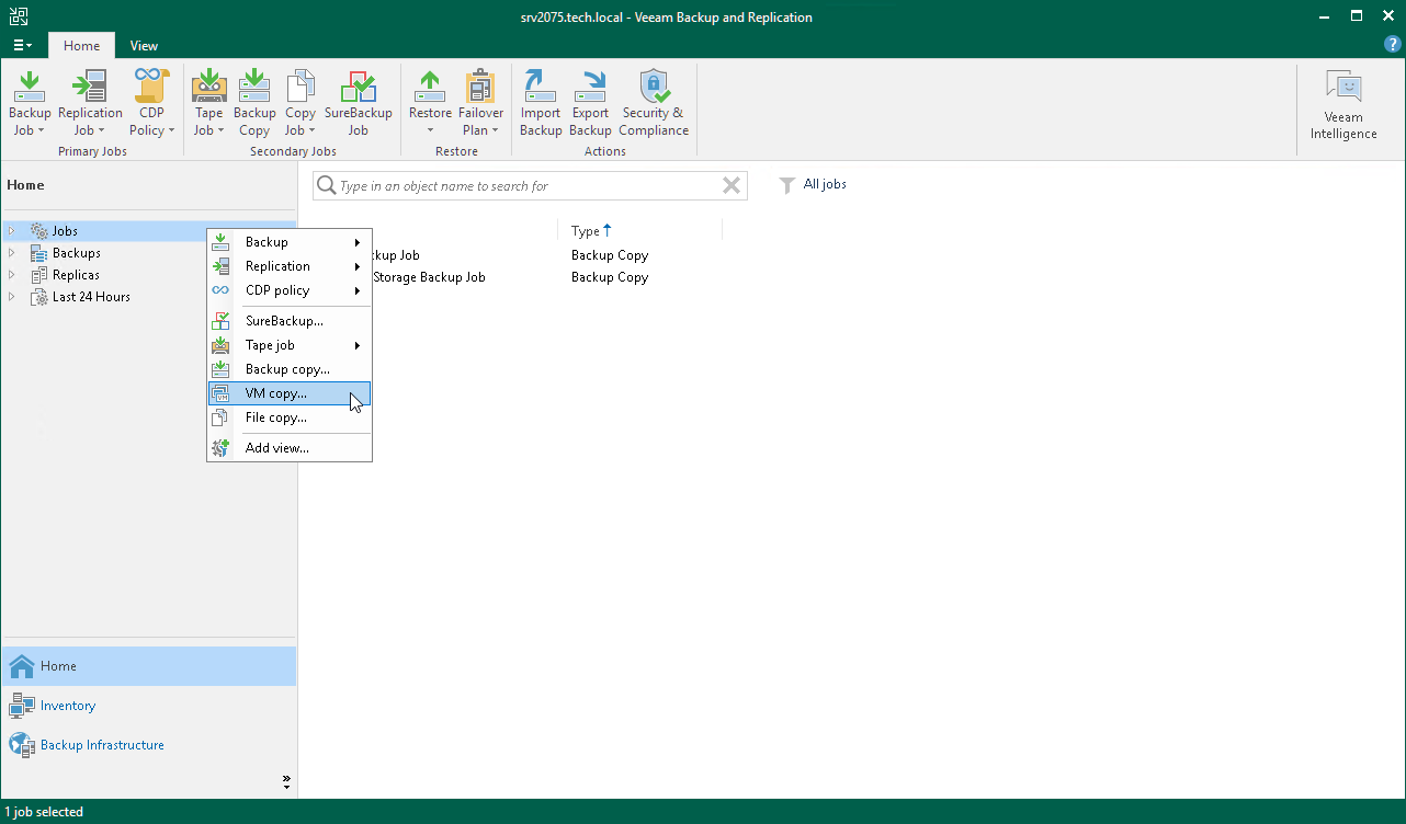 - Open the Home view. In the inventory pane, right-click Jobs and select VM Copy.