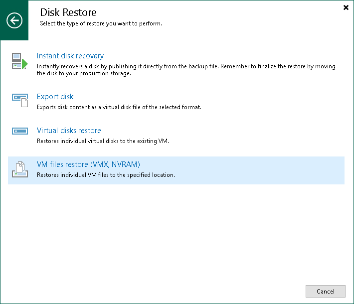 - On the Home tab, click Restore > VMware vSphere > Restore from backup > Disk restore > VM files restore (VMX, NVRAM).