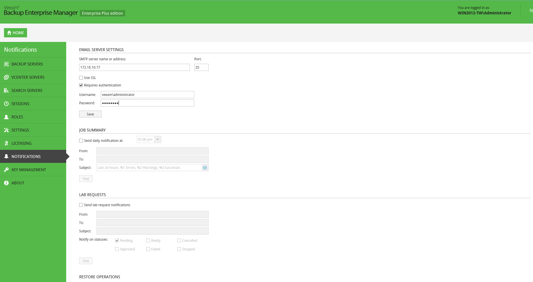 - If the SMTP server requires authentication, select the Requires authentication check box and specify authentication credentials.
