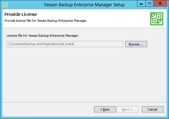 At this step, specify a valid Veeam Backup & Replication license that was sent to you after registration. Click Browse and select the necessary .lic file.