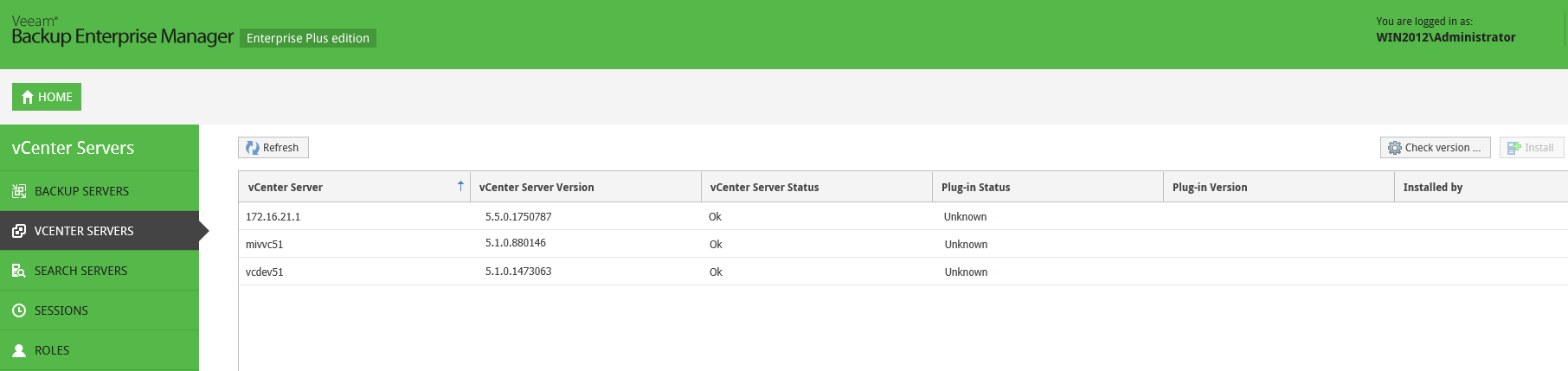 - Check version – use this command to request vCenter server version and operation status; if Veeam plug-in for vSphere Web Client is deployed, its version, status and installation account will be also displayed.