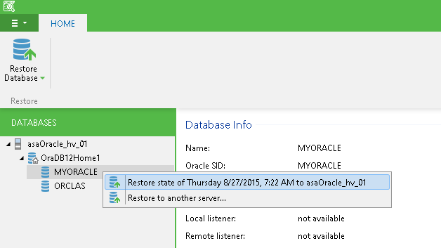 With 1-Click Restore, Veeam Explorer for Oracle allows you to quickly restore a database to the original location (that is, the original Oracle server hosting the database). You can restore selected database to the current state, or to the certain point in time - for that, make sure the Oracle backup job was set up properly (see Required Oracle Server Backup Job Settings) and completed successfully.
