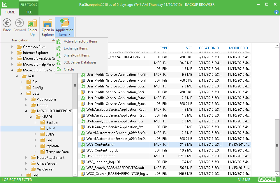 - On the Veeam Backup Browser toolbar, click Open in Explorer, then locate the Microsoft SharePoint content database files from which you want to restore data (see Locating Content Database File). Copy the path to clipboard and click SharePoint Items to start Veeam Explorer.