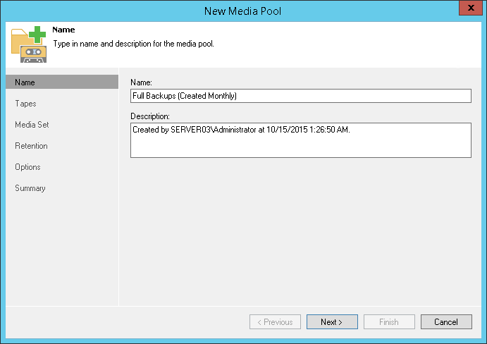 - In the Description field, enter a description of the new media pool. The default description contains information about the user who created the media pool, date and time when the media pool was created.