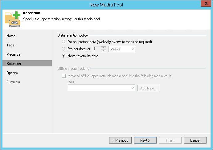 At the Retention step of the wizard, specify overwrite rules for cases when all tapes allocated to the media pool are full (and there are no more free tapes available). You can select one of the following options: