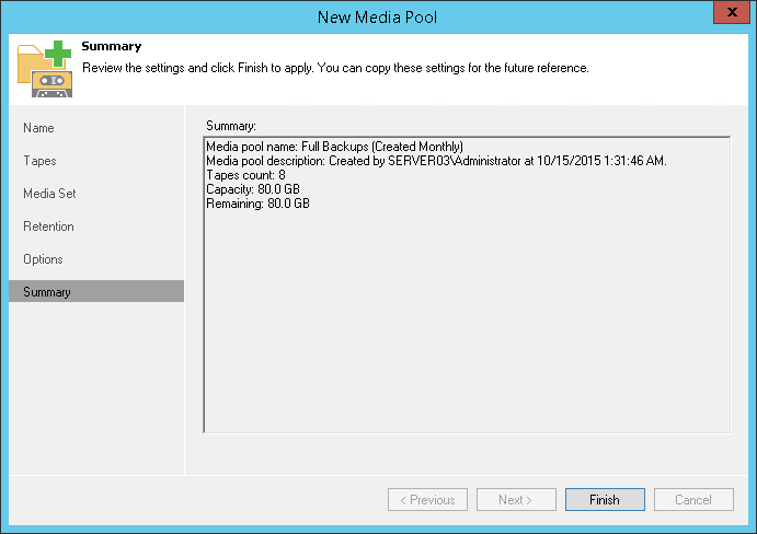 A new media pool will be available under the Tape Infrastructure > Media Pools node in the Tape Infrastructure view.