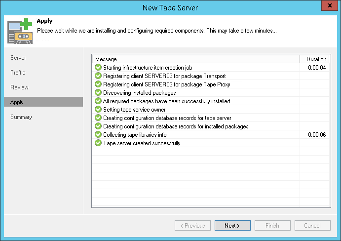 At the Apply step of the wizard, Veeam Backup Free Edition will add the tape server to the backup infrastructure in the real time mode.