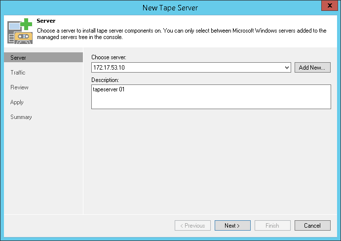 - If the devices are connected to a separated server, enter the server name or IP address. The tape server must run Microsoft Windows. If the server is not added to Veeam Backup Free Edition yet, you can click Add New to open the New Windows Server wizard.
