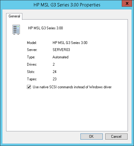 Open the Tape Infrastructure view, expand the Libraries node and select the needed library. Click Properties on the ribbon. You can also right-click the necessary library in the working area and select Properties. Select the Use native SCSI commands instead of Windows driver check box.