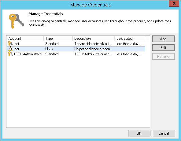 The Credentials Manager contains two system credentials records: a credentials record for the Veeam FLR appliance and a credentials records for the tenant-side network extension appliance. You cannot delete these credentials records. However, you can edit them: change a password and record description. |