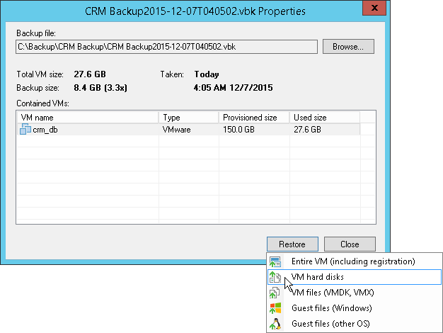 You can restore VM hard disks from a VeeamZIP file created in Veeam Backup Free Edition and from a backup file or a VeeamZIP file created in Veeam Backup & Replication.