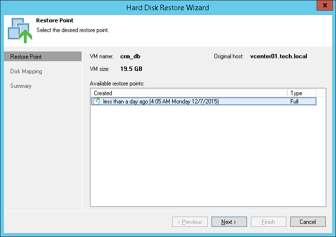 At the Restore Point step of the wizard, select the restore point from which you want to restore the VM disk(s).