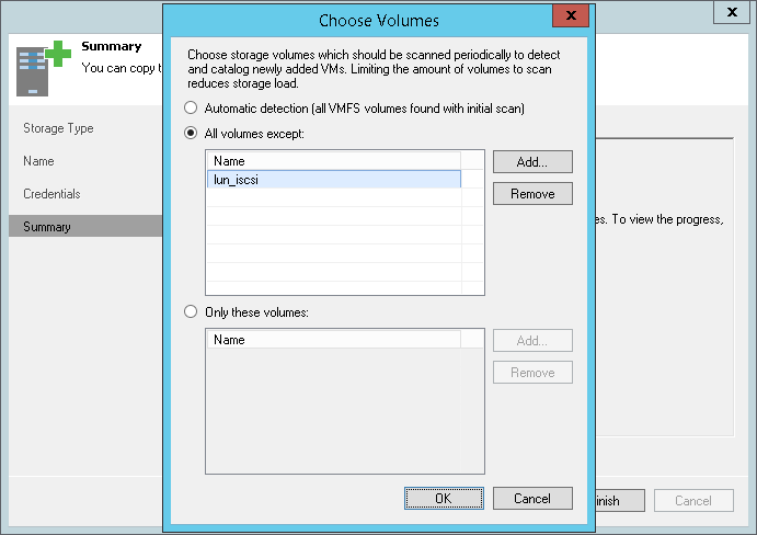 - To exclude volumes from rescan, select All volumes except, click Add and select volumes from the list.