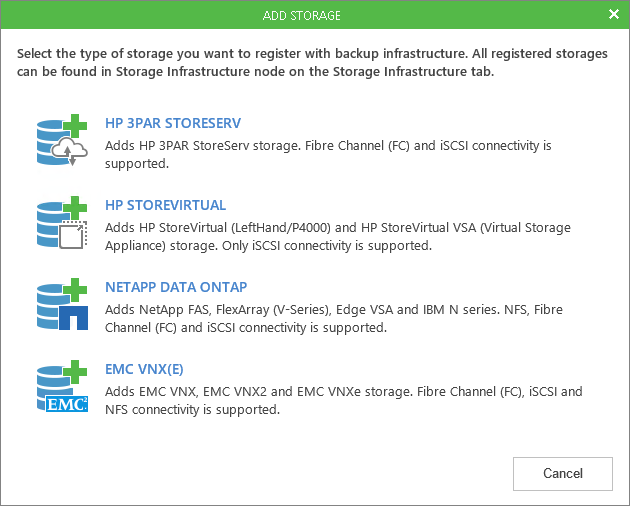 - Open the Storage Infrastructure view, in the inventory pane right-click the Storage Infrastructure node and select Add Storage. In the displayed window, click EMC VNX(e).