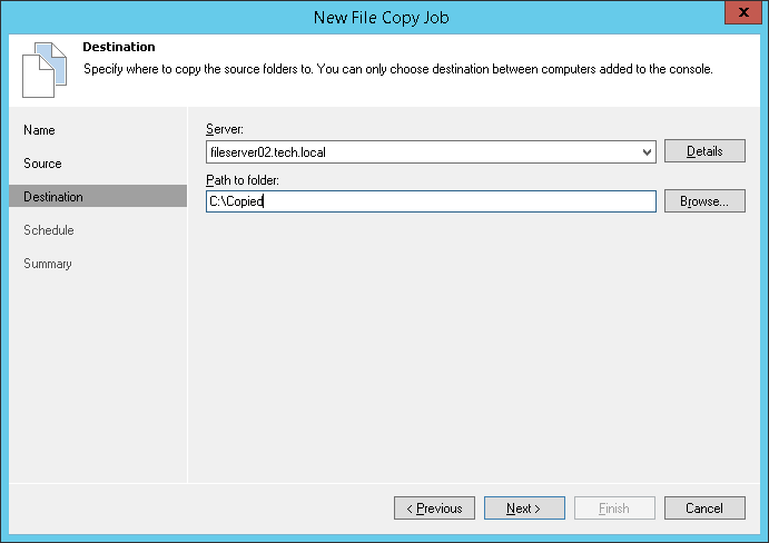 At the Destination step of the wizard, select a destination to which files or folders must be copied.