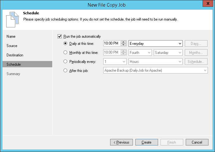At the Schedule step of the wizard, you can select to run the file copy job manually or schedule the job to run on a regular basis.