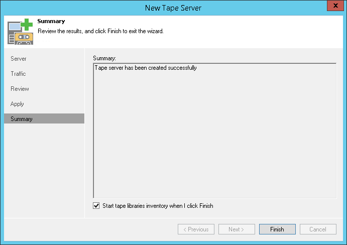 - To inventory tape libraries connected to the tape server, select the Start tape libraries inventory when I click Finish check box. Veeam Backup Free Edition will start the inventory process when you finish working with the wizard.