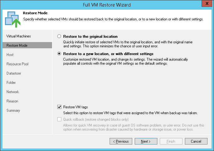 • Select Restore to a new location, or with different settings if you want to restore the VM to a different location and/or with different settings (such as VM location, network settings, the format of restored virtual disks and so on). If this option is selected, the Full VM Restore wizard will include additional steps for customizing VM settings.