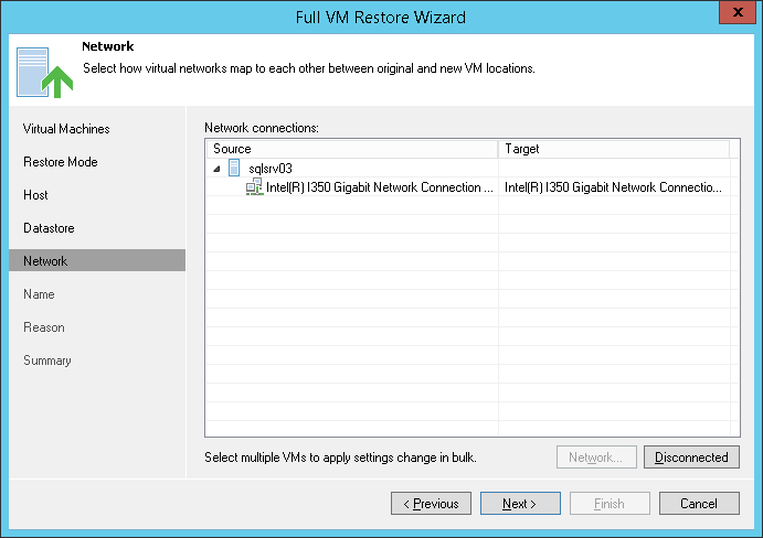 If you do not want to connect the restored VM to any virtual network, select the VM in the list and click Disconnected.