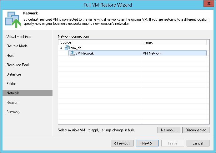 If you do not want to connect the restored VM to any virtual network, select the VM in the list and click Disconnected.