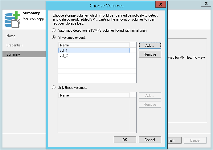 - To exclude volumes from rescan, select All volumes except, click Add and select volumes from the list.