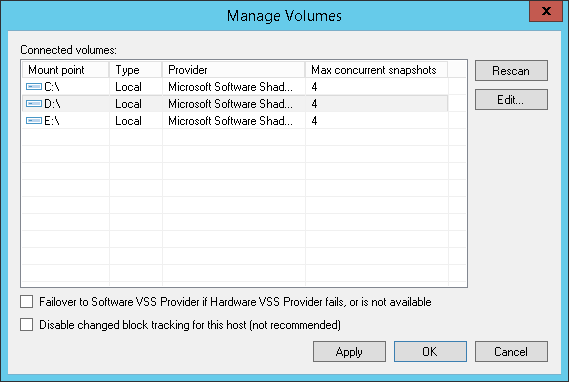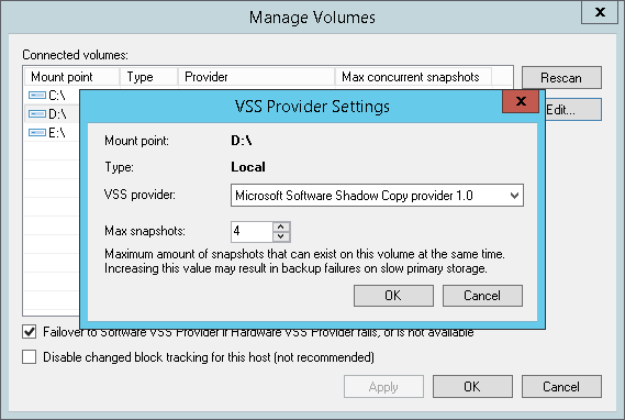 - In the Manage Volumes window, clear the Failover to Software VSS Provider if Hardware VSS Provider fails to create a snapshot check box.