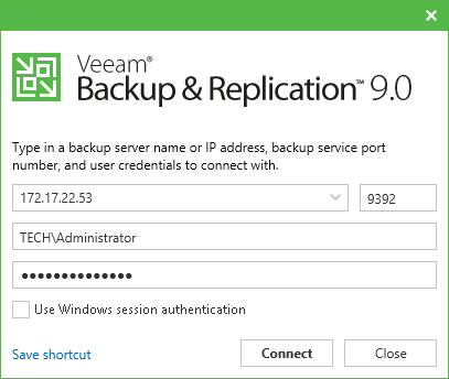 To log on to Veeam Backup Free Edition, you must open the Veeam Backup Free Edition console and specify connection settings to access the backup server.