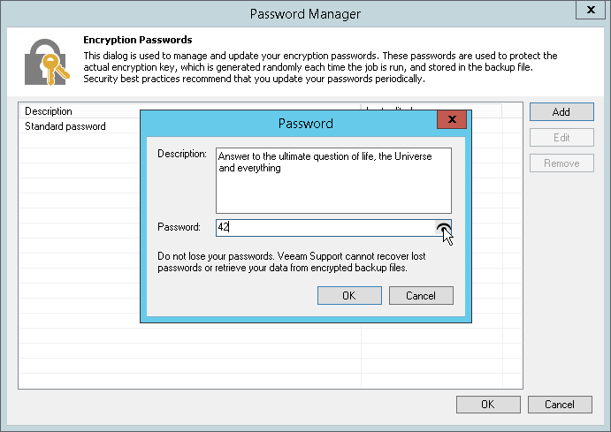 - In the Description field, specify a hint for the created password. It is recommended that you provide a meaningful hint that will help you recall the password. The password hint is displayed when you import an encrypted file on the backup server and access this file.