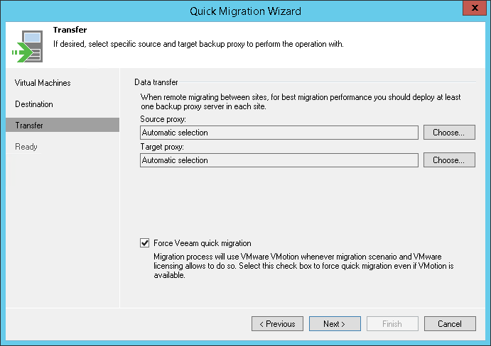 At the Transfer step of the wizard, you can optionally select which migration mechanism to use: VMware vMotion or Veeam Quick Migration.