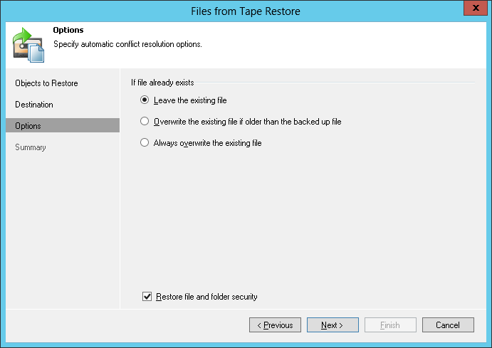 - Always overwrite the existing file. Select this option if you want to overwrite the existing file with the restored file in all cases.
