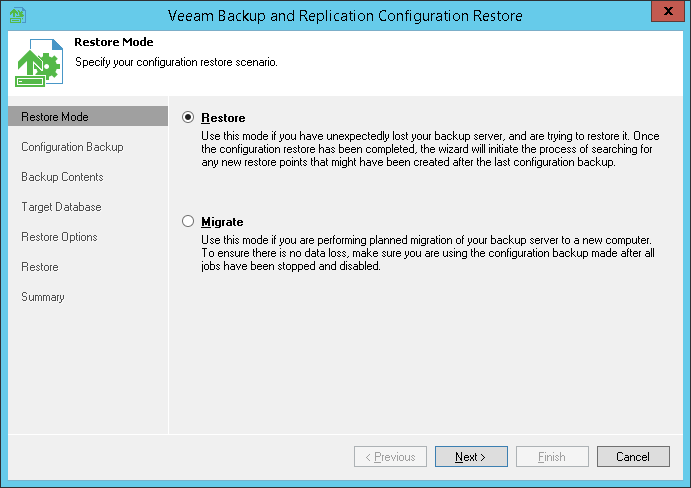 - Select Migrate if you want to restore data from the configuration backup to the database used by another backup server.