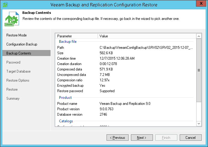 At the Backup Contents step of the wizard, Veeam Backup Free Edition will analyze the content of the selected backup file and display the following settings: