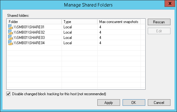Before you specify settings for a Microsoft SMB3 server, you must perform a rescan operation for shared folders on this server. During the rescan operation, Veeam Backup Free Edition retrieves information about shared folders that are currently hosted on a Microsoft SMB3 server, updates the list of shared folders and writes this information to the Veeam Backup Free Edition database.